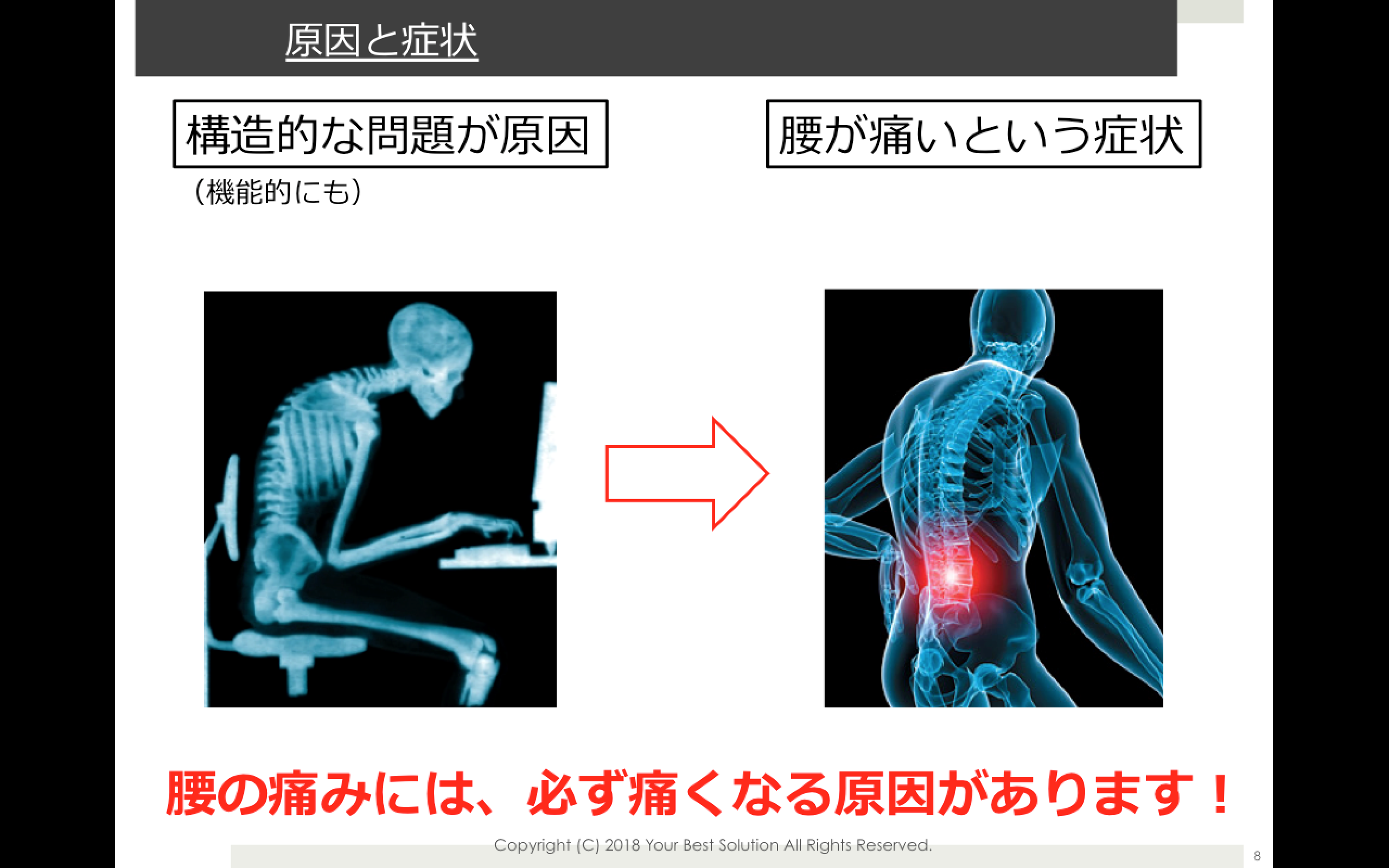 身体で考えてみても、「腰が痛い」というのはただの症状であり、原因ではありません。