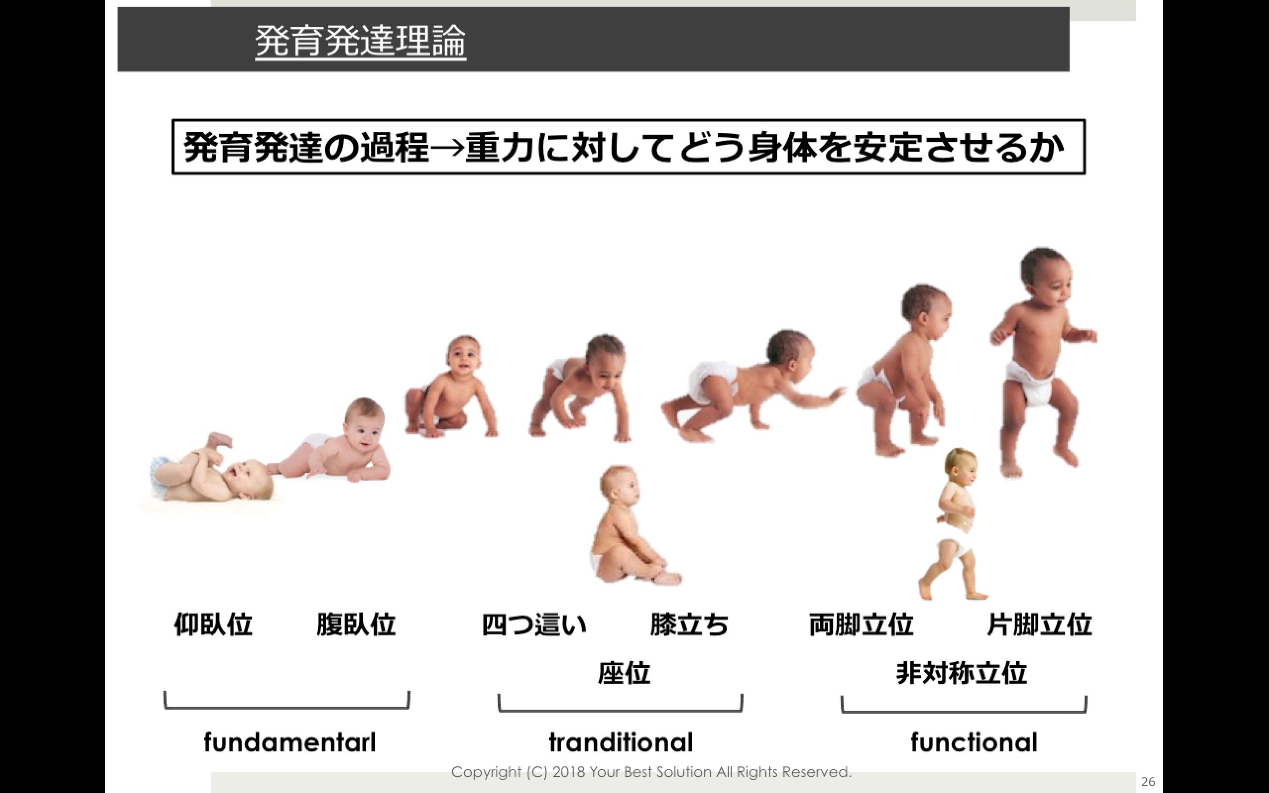 仰向け、うつ伏せ、四つ這い、膝立ち、座位、立位と、